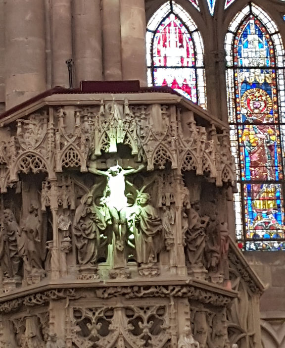 sur le dais de pierre qui surplombe le Christ de la chaire.